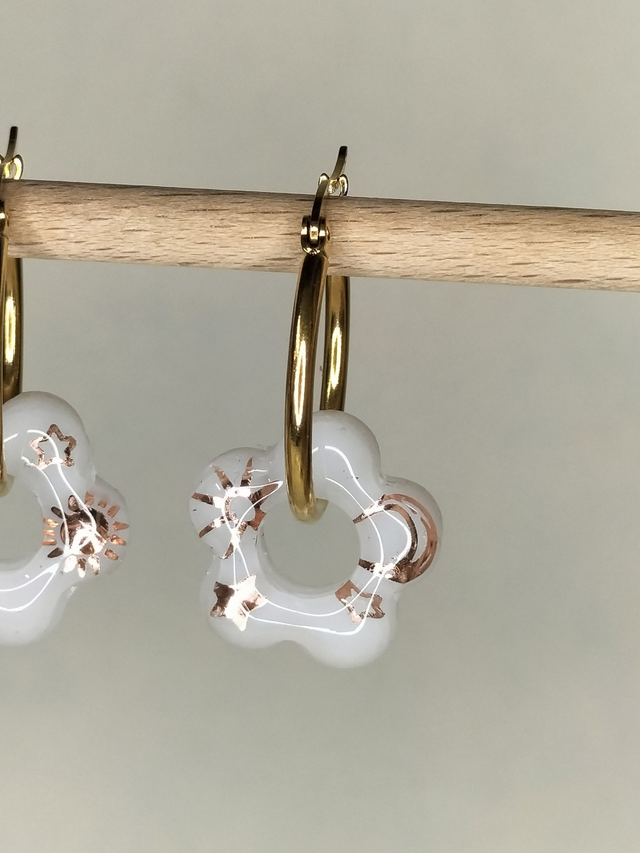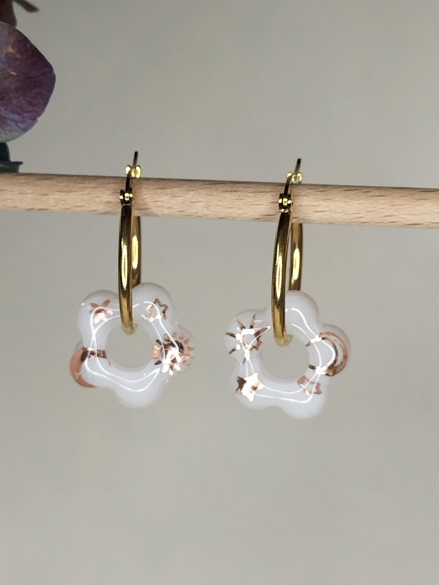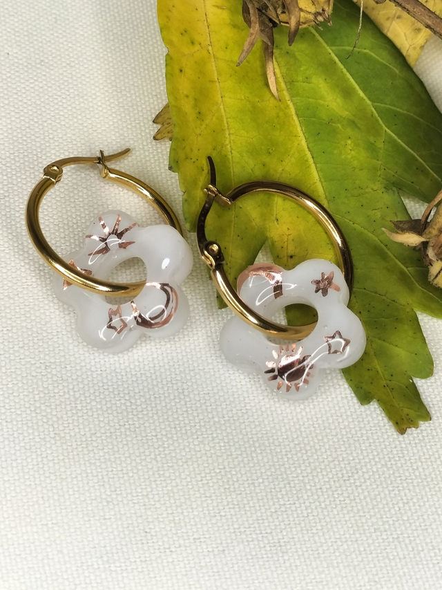 Paire de boucles d'oreilles créoles dorées, avec pampilles fleurs, résine brillante blanche. Motifs bronzes brillants lunes, étoiles, soleils.