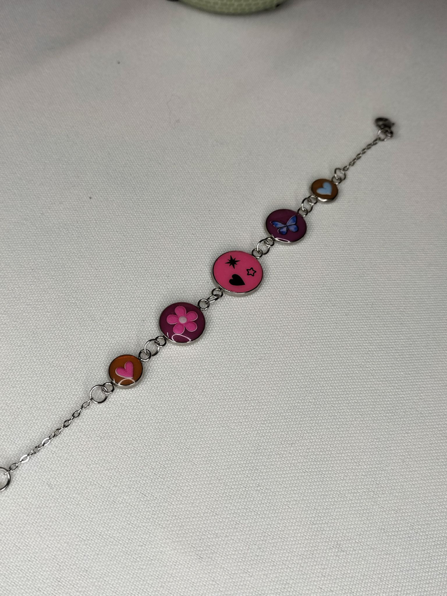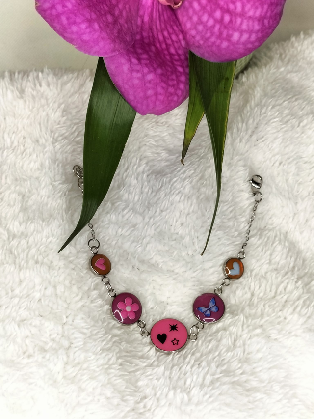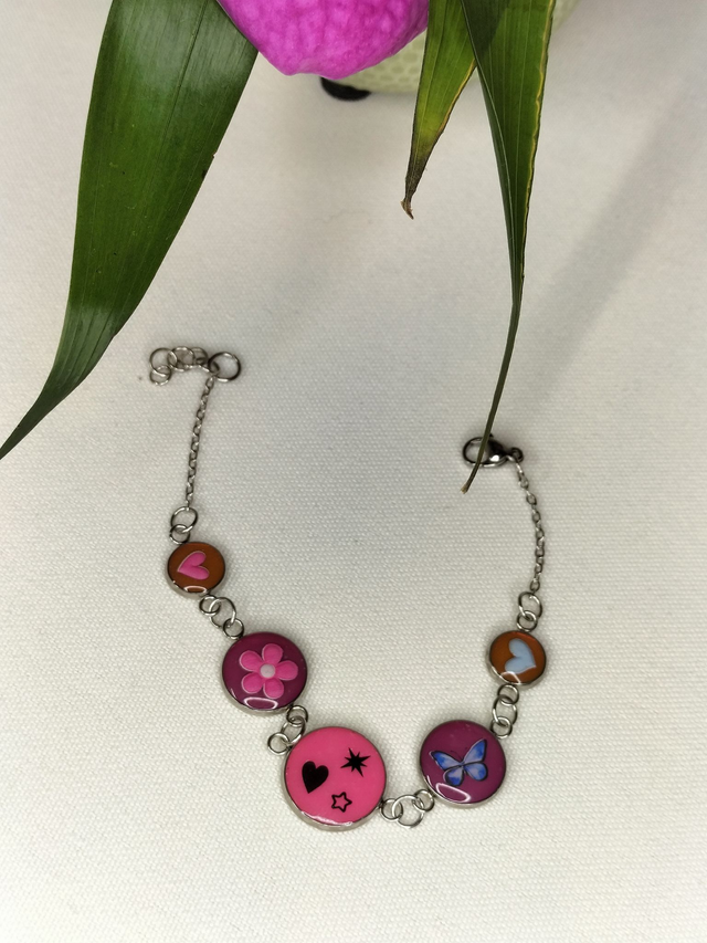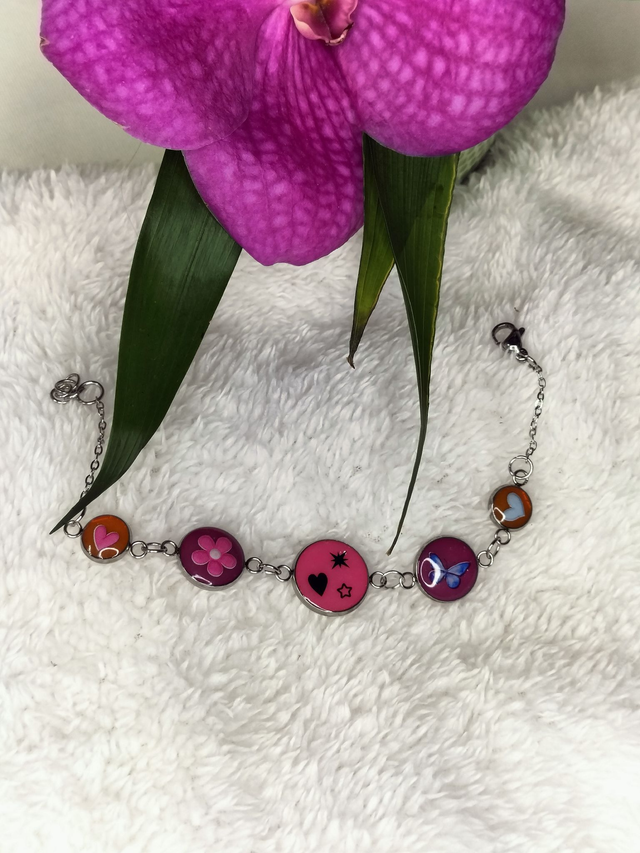 Bracelet argenté, résine rose, violette et orange. Motifs roses, bleus et noirs.