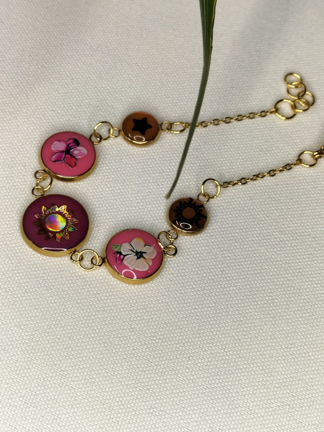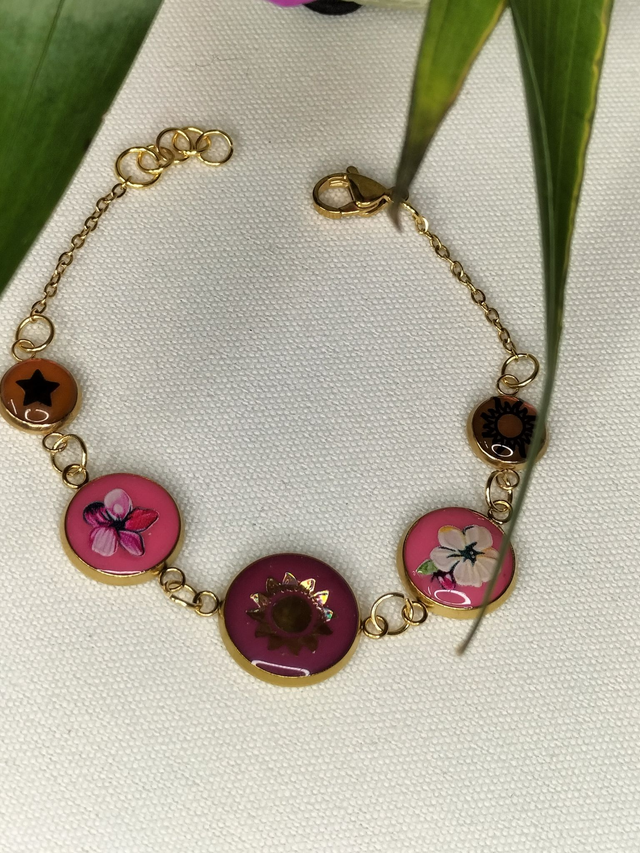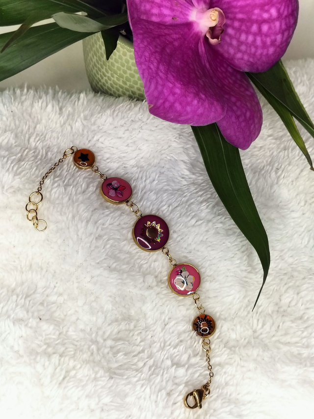 Bracelet doré. Résine rose, violette et orange. Motifs roses, noirs et or.