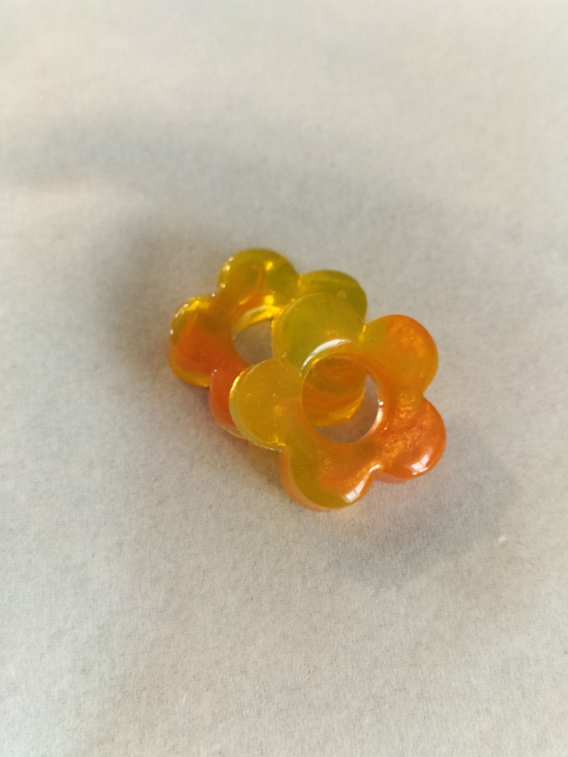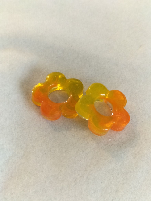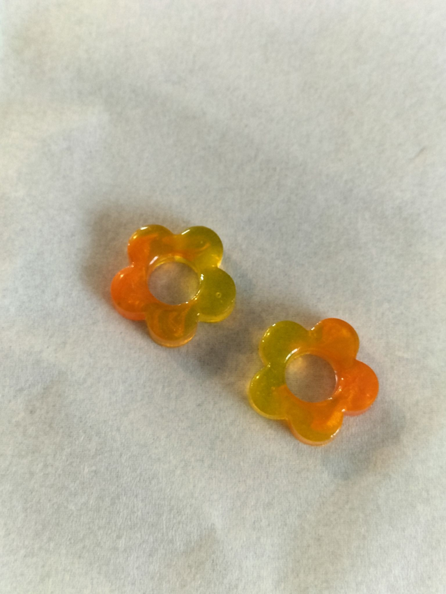 Pampilles fleurs acidulées, résine brillante jaune et orange. Lumière et transparence.