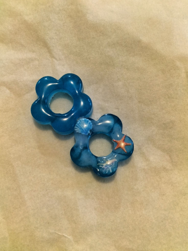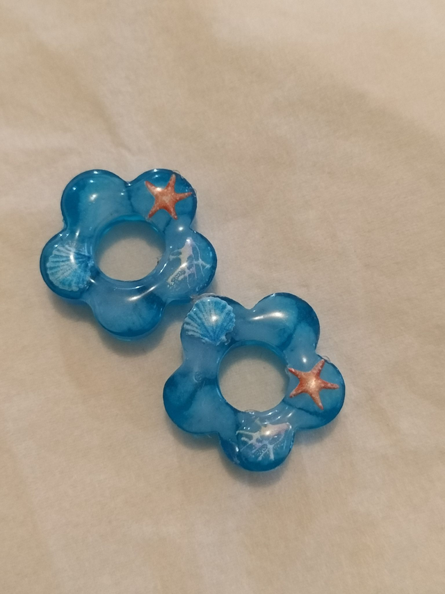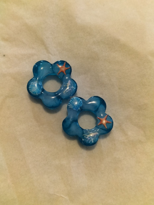 Pampilles fleurs, résine turquoise translucide et motifs océan.