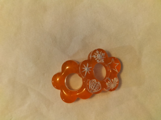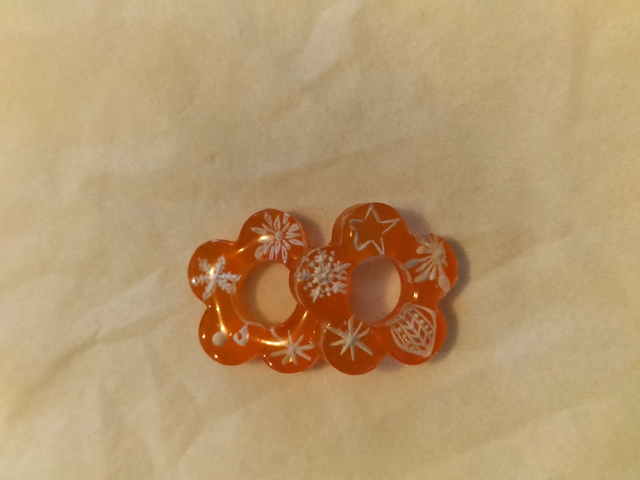Pampilles fleurs, résine toute orange. Petits motifs blancs thème hivernal.